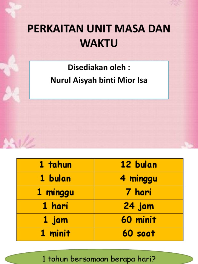 Januari = 31 hari 2. Oktober = 31 hari 3. 1 tahun = 365 hari (tahun biasa) = 366 hari (tahun lompat). Start studying masa dan waktu. Pendekatan ini ditunjukkan dalam indikator moving average eksponensial dan berwajaran.