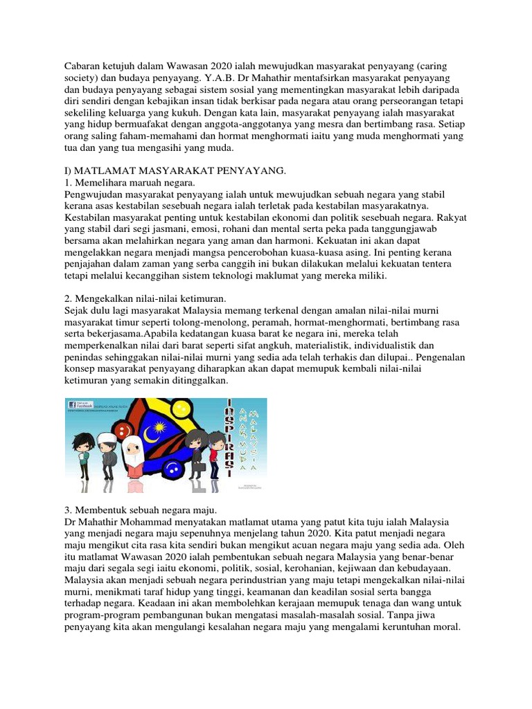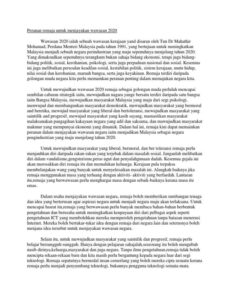 Wawasan 2020 bukanlah merupakan satu dasar khas tetapi merupakan tindakbalas kepada perkembangan ekonomi, sosial dan politik yang berlaku di peringkat nasional dan antarabangsa yang telah memberi cabaran hebat kepada negara. Program pemantapan dan pemasyarakatan (5/6). Cabaran merealisasi wawasan 2020 pmo related files Perdana menteri berkata, wawasan 2020 bertujuan menjadikan malaysia sebuah negara maju, dengan mengatasi sembilan cabaran. Free unlimited pdf search and download.