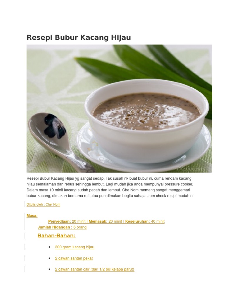 Dalam masa 10 minit kacang sudah pecah dan lembut. Selain rasanya yang enak dan lezat, bubur kacang hijau. Resepi bubur kacang hijau yg sangat sedap. Bahan yang di perlukan~kacang hijau 250gr (rendam 1 jam)~sanatan 300ml dari 1/2 biji kelapa (pakai santan kotak pun boleh)~125gr gula pasir~100gr gula. Bubur kacang hijau adalah makanan khas nusantara yang terbuat dari kacang hijau yang dimasak dengan air dan gula aren bersama seikat daun pandan.