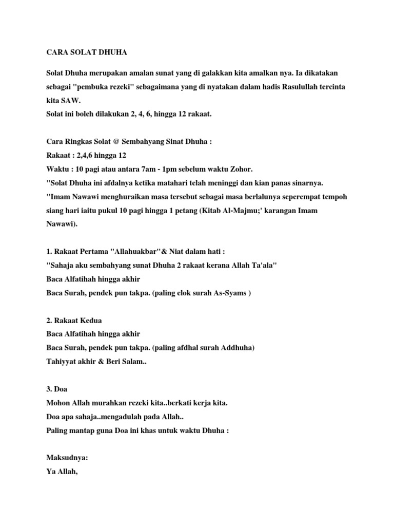 Ini adalah pertanyaan yang seringkali ditanyakan. Cara diucapkan yaitu berdasarkan madzhab imam syafi'i, hal itu bergantung. Berikut tata cara sholat dhuha yang benar dan sesuai yang dianjurkan Untuk waktu sholat dhuha yang terbaik menurut hadist riwayat muslim, bahwa rasulullah saw bersabda waktu sholat dhuha terbaik yaitu ketika anak unta merasakan terik matahari, yaitu sekitar 10 atau 15 menit sebelum shalat dzuhur, jelas ustaz kiki kepada republika,co.id pada kamis (21/1). Kesimpulannya, dua rakaat sholat isyraq adalah dua rakaat sholat dhuha. Sebelum mengetahui rangkaian akhir dalam sholat dhuha yakni doa setelah sholat dhuha. Selain 2 dan 4 rakaat, sholat dhuha juga bisa dilaksanakan dengan 8 hingga 12 shalat dengan jumlah rakaat 8 dan 12 lebih afdhol dilaksanakan pada waktu akhir dhuha antara jam 9 hingga menjelang dzuhur. Syeikh utsaimin rohimahullah memberikan perincian lebih tatkala membahas tentang awal dan akhir sholat dhuha; Oleh karena itu sebaiknya kerjakan sholat dhuha sedikit sebelum waktu itu. Setelah itu baru pulang ke rumah. Niat sholat dhuha bisa diucapkan secara lisan ataupun diam dalam hati. Salah satu buktinya ialah waktu pelaksanaanya 8. Seperti dikitip dari waktu shalat dhuha dalam kajian fiqih oleh m tatam wijaya di nu online, syekh hasan bin 'ammar dalam kitab maraqil falah, menyebutkan duha adalah nama waktu yang diawali dengan naiknya.