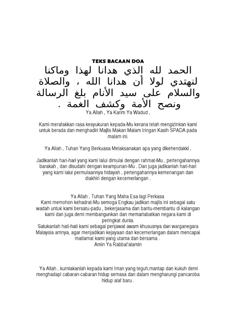 Doa majlis makan malam الحمد لله الذي هدانا لهذا وماكنا لنهتدي لولا أن هدانا الله ، والصلاة والسلام على سيد الأنام بلغ الرسالة ونصح الأمة وكشف الغمة. Setiap doa yang diucapkan pasti akan didengari oleh nya dan pasti termakbul dengan keizinan nya. 3% menganggap dokumen ini tidak bermanfaat, tandai dokumen ini sebagai tidak bermanfaat. Mengumumkan ketibaan timbalan menteri pelajaran 1, kementerian dengan berakhirnya persembahan itu tadi, maka sampai di sinilah sahaja majlis pada malam ini. Skrip majlis makan malam mesra pibg clifford tahun.